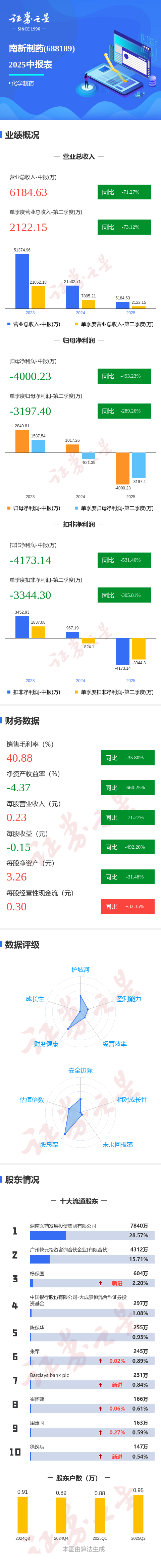 证券之星消息,南新制药2025年中报显示,公司主营收入6184.63万元,同比下降71.28%;归母净利润-4000.23万元,同比下降493.23%;扣非净利润-4173.14万元,同比下降531.47%;其中2025年第二季度,公司单季度主营收入2122.15万元,同比下降73.12%;单季度归母净利润-3197.4万元,同比下降289.26%;单季度扣非净利润-3344.3万元,同比下降305.81%;负债率22.17%,投资收益-27.54万元,财务费用-100.54万元,毛利率40.88%。
